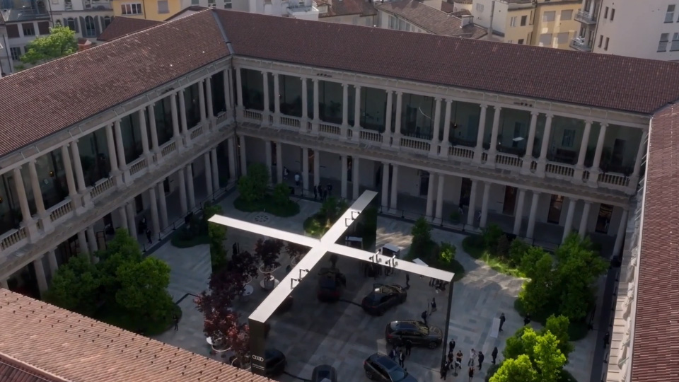 At Milan Design Week 2024, Audi presented the artistic concept “Reflaction”. A large mirrored cross divided one of Milan’s beautiful courtyards into four sections. When standing in front of each segment, the reflection blended so seamlessly with its surroundings that it almost appeared as if you could see through the walls. One of the four sections featured four tall, vertical columns that served as versatile canvases for artistic expression.